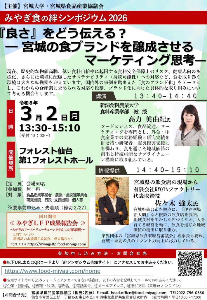 宮城大学・宮城県食品産業協議会主催による「みやぎ食の絆シンポジウム2026」が、令和8年3月2日(月)に開催されます。